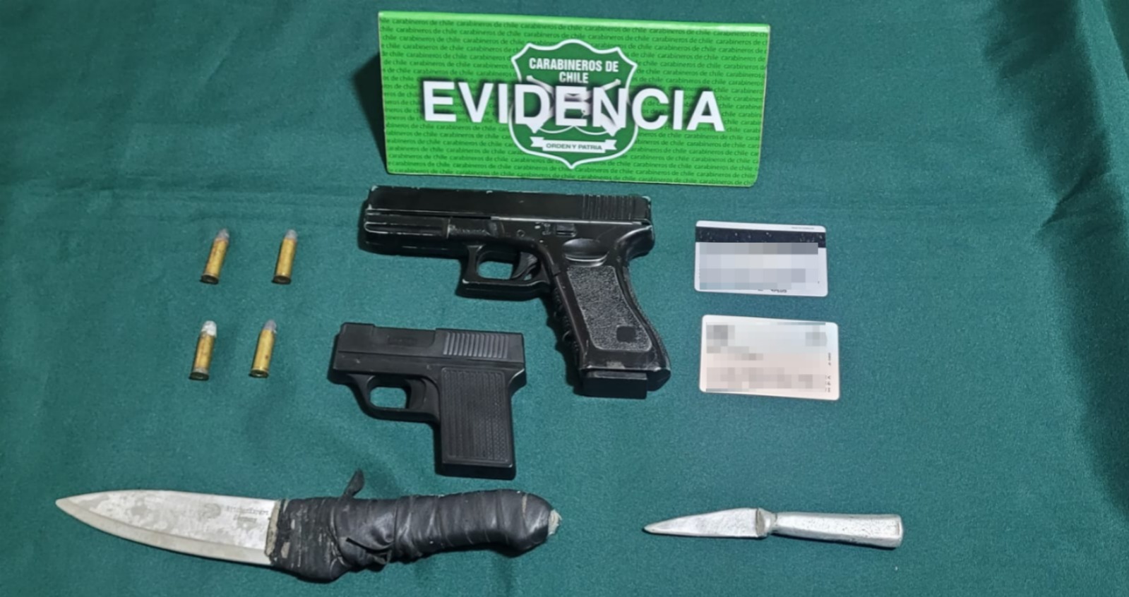 Durante el procedimiento, Carabineros incautó dos pistolas —una de balines y otra de fantasía tipo encendedor—, además de armas blancas, munición y documentos pertenecientes a víctimas.