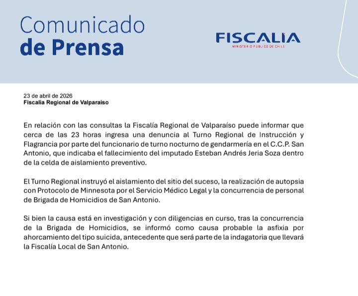 Tras su detención, el imputado fue ingresado al Centro de Cumplimiento Penitenciario de San Antonio, donde durante las últimas horas fue hallado sin vida en una celda, situación que activó diligencias investigativas.