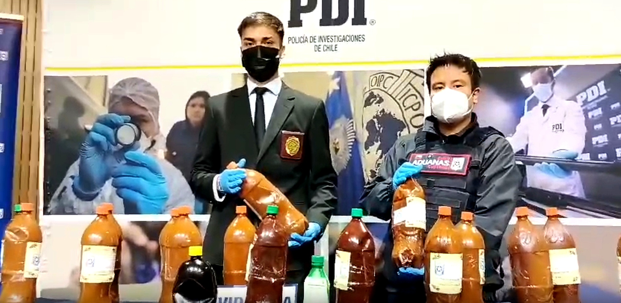 El procedimiento se originó en el Paso Fronterizo Los Libertadores, donde detectives de la Brigada Antinarcóticos y Contra el Crimen Organizado de Los Andes identificaron a un ciudadano brasileño adulto que transportaba 23 botellas de dos litros ocultas en su equipaje. El contenido, una sustancia líquida, fue sometido a análisis por especialistas, confirmándose que correspondía a un compuesto regulado por la Ley 20.000.