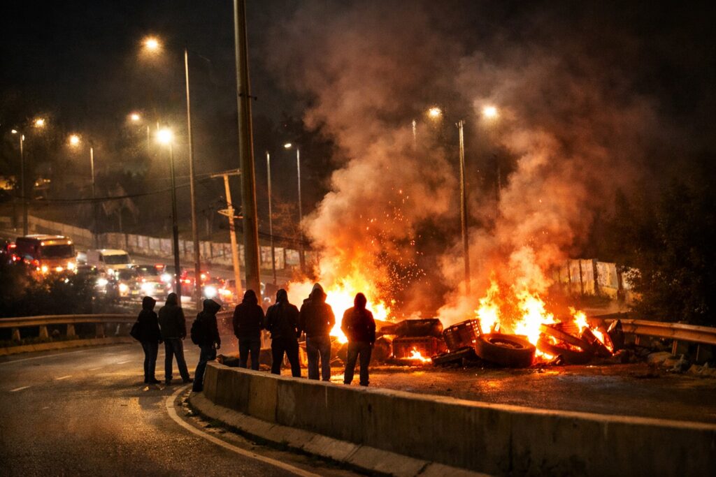 Una protesta con barricadas mantiene completamente suspendido el tránsito vehicular en el Camino Troncal, una de las principales vías que conecta las comunas de Viña del Mar y Quilpué, en la región de Valparaíso.
